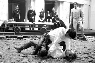 Ezerszer eljátszották, és ezeregyedikszer is megfejtésre vár. Így is tetszett, tetszik és tetszeni fog. Victor Ioan Frunză, a temesvári Hamlet rendezője a színrevitelhez olyan terepet választ - göröngyös, lerobbant vasúti pályaudvart -, amely önmagában rákényszeríti az eddigi Hamlet-előadásokkal való szakításra. Ez a hely - Adriana Grand díszlettervező alkotása - nem középkori vár ábrándja, nem önmaga fönségébe fulladt királyi udvar, de nem is vidám temető, a földi viháncolás torz tükre. Az itt játszó számára eleve kizárt minden szentimentalizmus, romantika, közhelyes tragédia és szépelgés. A király koporsóját illő helyére gördítik - egy vakvágányra. És pereg a film mint gyászszertartás, közben kézről kézre adják a gondosan összehajtogatott koporsótakarót - szabadul tőle mindenki, mint a leprástól. Végül Hamlet herceg kezében marad. Szintén az illő helyén... Nincs kinek továbbadnia. És nem is kell továbbadnia, mert sorsává lett a gyász - és a gyász hiányának számonkérése! A temetés haszonélvezői elégetik a vetítővásznat, hogy ne kelljen látniuk a reá vetülő sztorit. A filmet nem égetik el... Aztán zavartalanul férjhez mennek, megnősülnek, követeket fogadnak, küldenek, mulatságot szerveznek, szolgálatba állítják a megfigyelőket, kémkedik mindenki mindenki után - teljessé lesz a lázas aktivitás látszata. Visszatér az élet a rendes kerékvágásba.